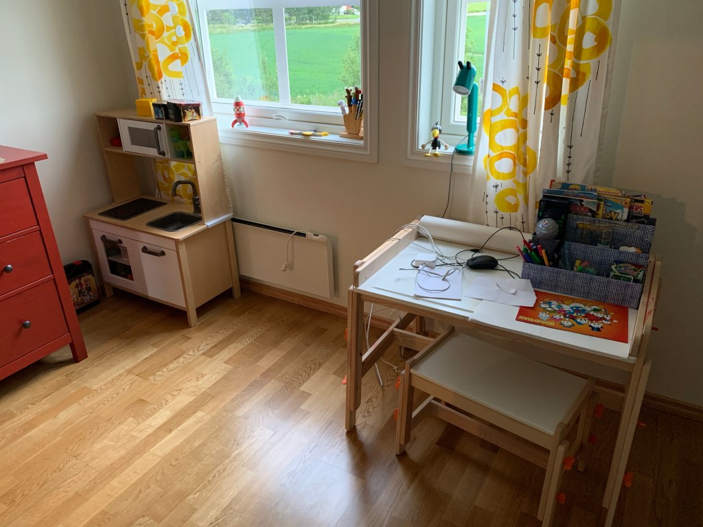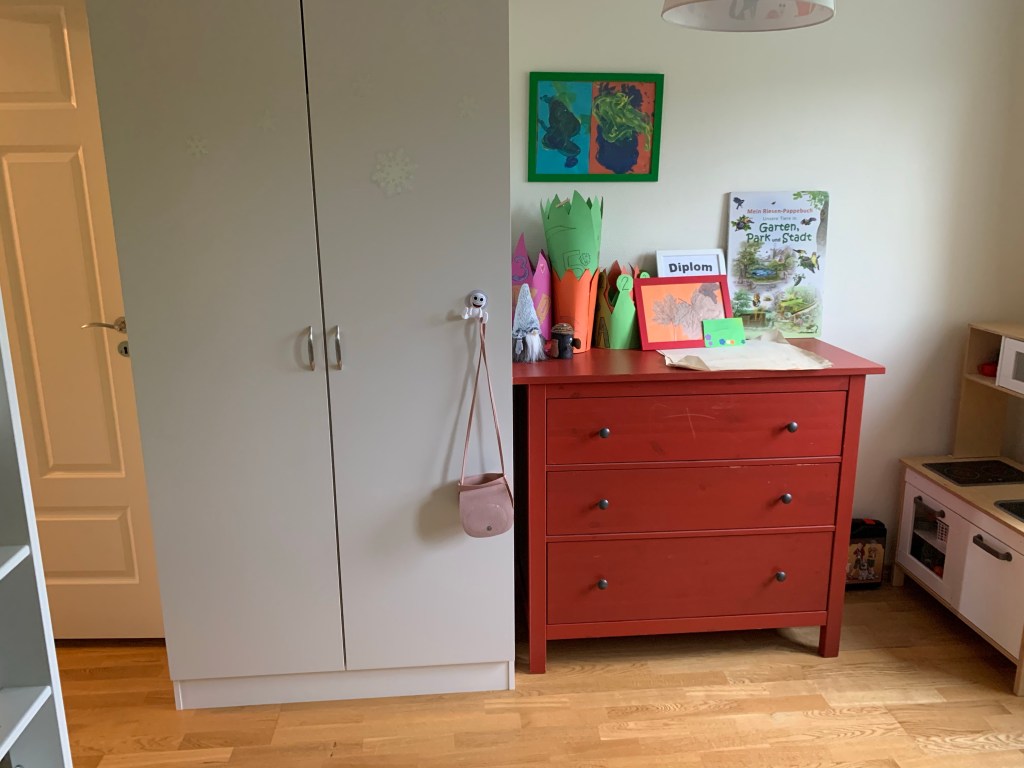 Vorher-Bilder gibt es kaum, nur vom drawer of doom. Stellen Sie sich so einfach 5 Schubladen, 6 Regalfächer, 1 Schreibtisch, 1 Spielküche und 2 randvolle Klappkörbe vor. Alle voller… Zeug. Wild durcheinander fliegendem Kleinkram.