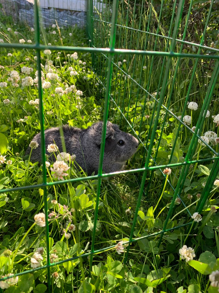 Heute Schweinchen gesäubert. Dafür erst mal den Draußenauslauf besser von oben gesichert. Und vergrößert. Die Sicherung ist noch provisorisch, bis die bestellten Karabiner da sind, aber jetzt ist es schon mal Katzensicherer und auch Vogelsicherer und macht mehr Schatten. Und was machen die Schweinchen? Nix. Marshmallow lag wie die Königin im Schweinshohen Klee (dieser Teil der Wiese wird nicht gemäht, unabhängig von Schweinchen) und chillte, Pølse lag wie die Königin unterm Häuschen und chillte. Bewegt hat sich nur Muffin, der später dran war und den ganzen Auslauf (2,7 x 2,7 m) für sich hatte.